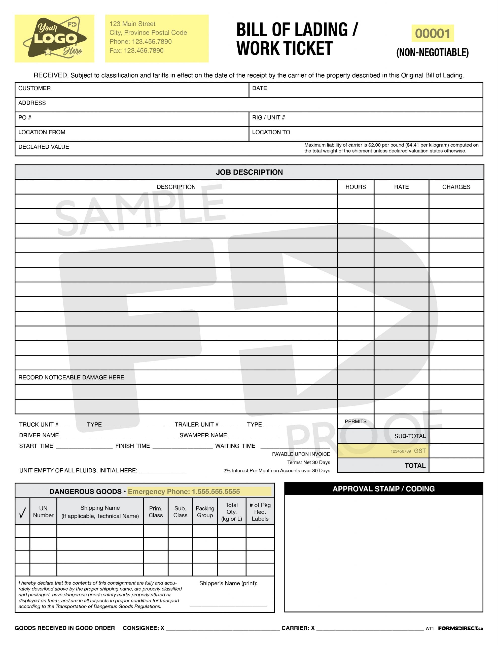 Our Bill of Lading / Work Ticket | WT1 template gives you the basic requirements of a standard BOL with the added flexibility of a work ticket. You can keep your cargo moving easily with this form by including all the details of the shipment. The standard consignee and carrier details are supplemented with 12 rows for detailing billable items. Also provided is a dangerous goods table and an approval stamp box for collecting authorizations in the field. This work ticket is a great choice for energy sector fluid haulers. A clear and precise BOL includes a detailed description of the goods being shipped, the quantity of goods, where they are going, who is receiving them, who is being billed for the freight charges and any other additional data.