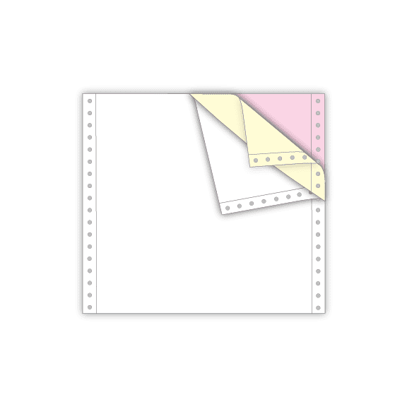 Blank, off-the-shelf continuous feed paper in white, canary (yellow), pink colour sequence, created for use with line printers with a tractor feed mechanism.