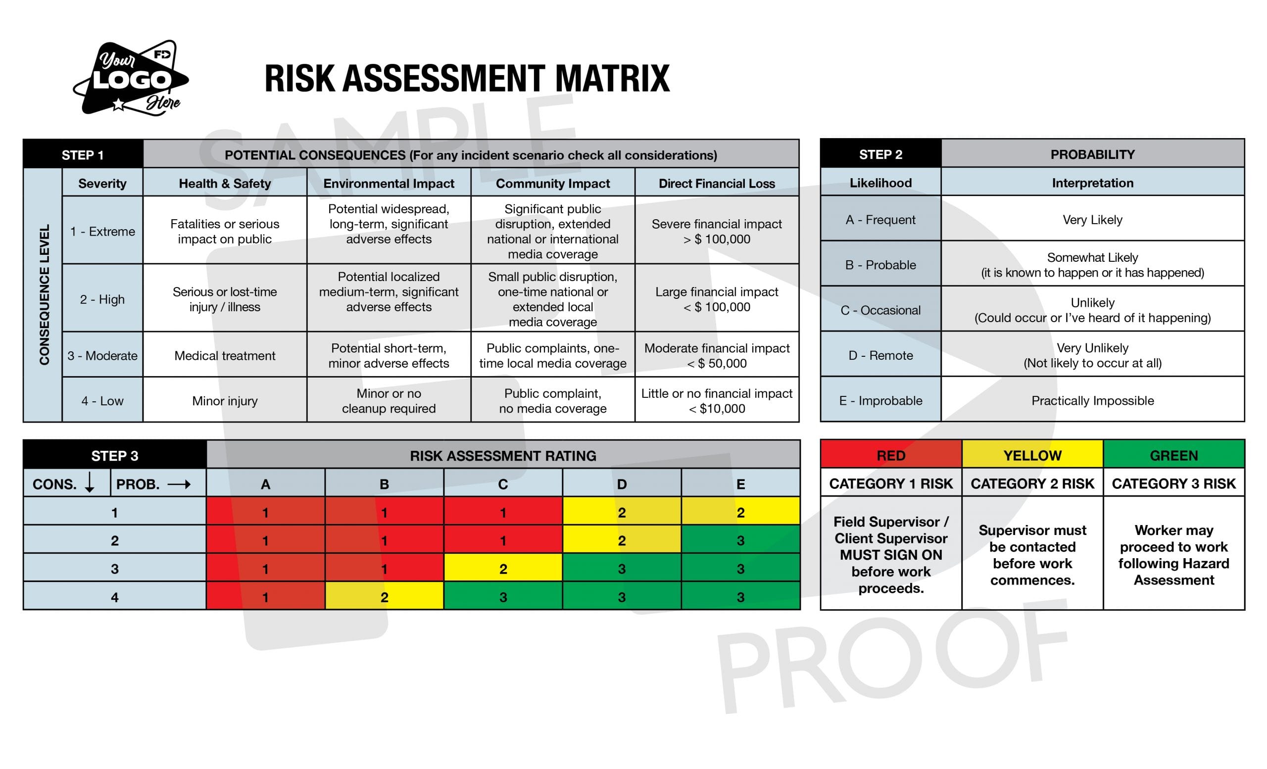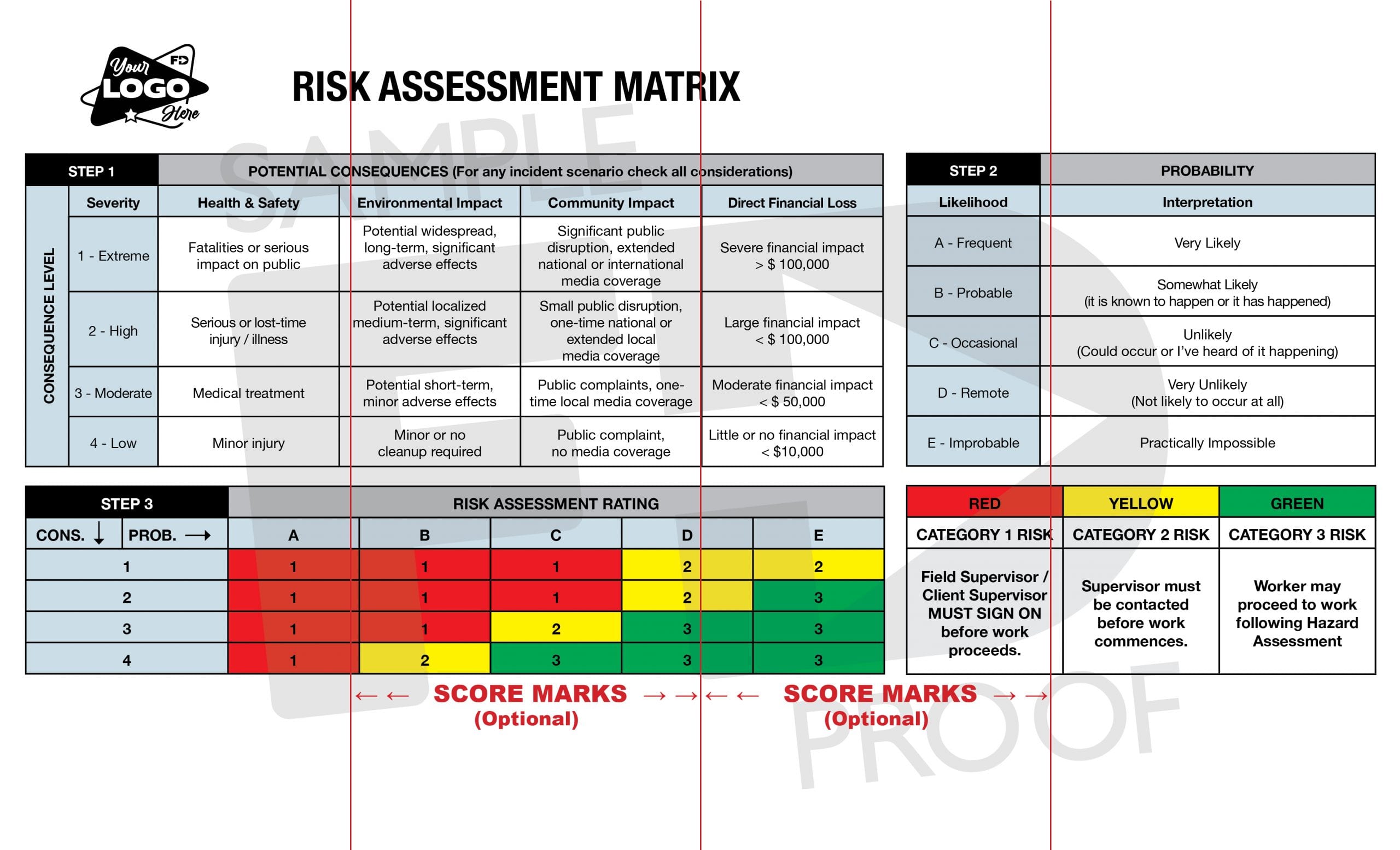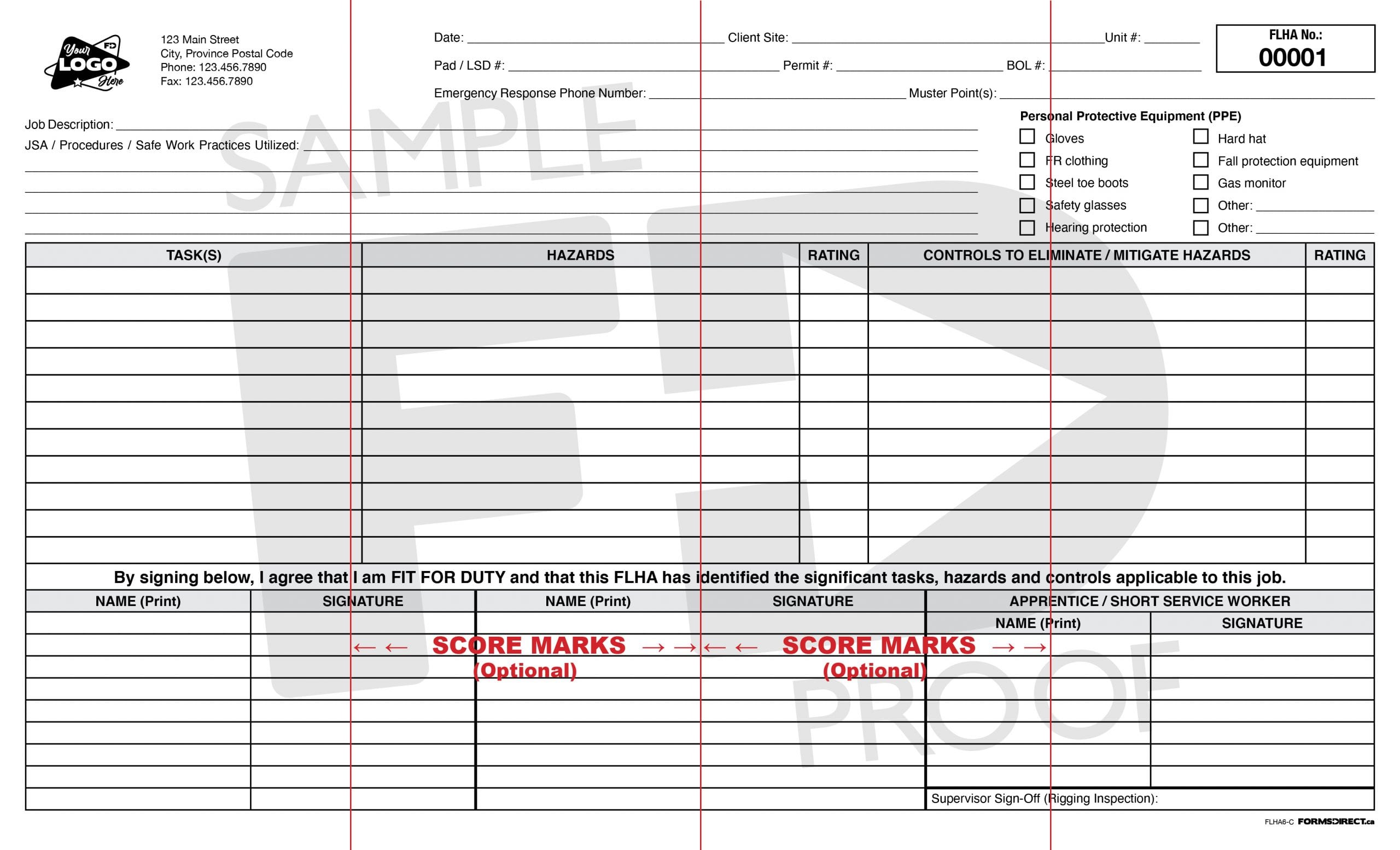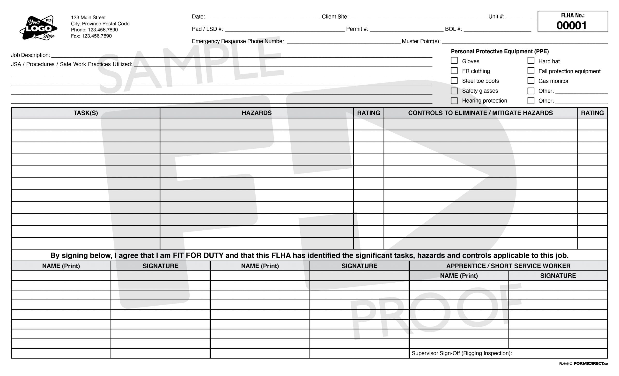This large 14″ x 8.5″ Field Level Hazard Assessment Card | FLHA6C template features 11 extra wide rows for recording tasks, hazards and controls. Also included is a handy PPE checklist (quick and easy documentation of safety equipment) and tons of room for participant signatures. The card back (which can be printed in either colour or grayscale) provides a detailed 3-step risk matrix (consequences, probability and rating chart).