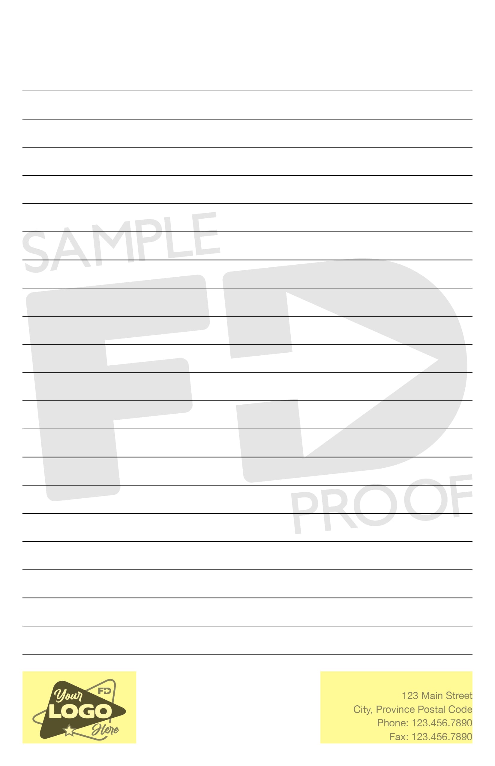 Our Half Letter Notepad | NP-H2 template is popular for its clean, functional design. Classic lines fill the page, giving way to a subtle branded footer, complete with logo and contact information. All of our 5.5″ x 8.5″ half letter notepads are available to order in 25-page or 50-page formats.
