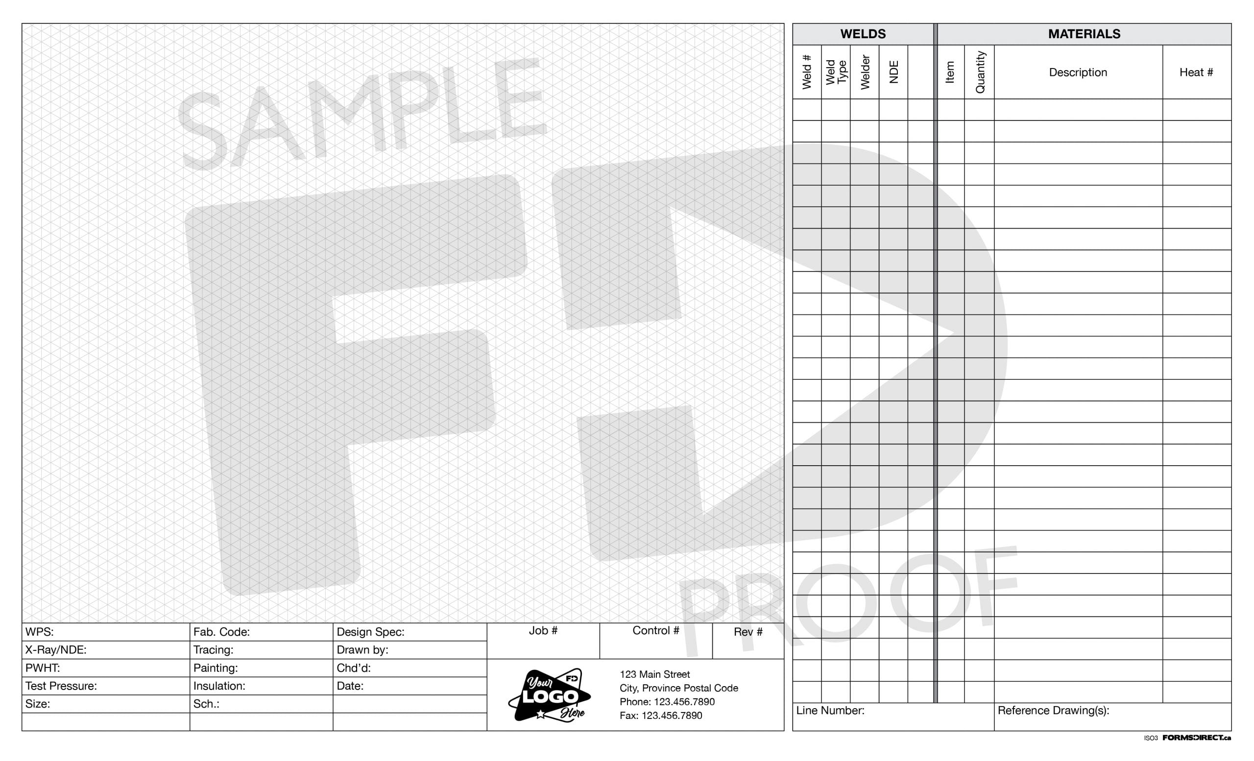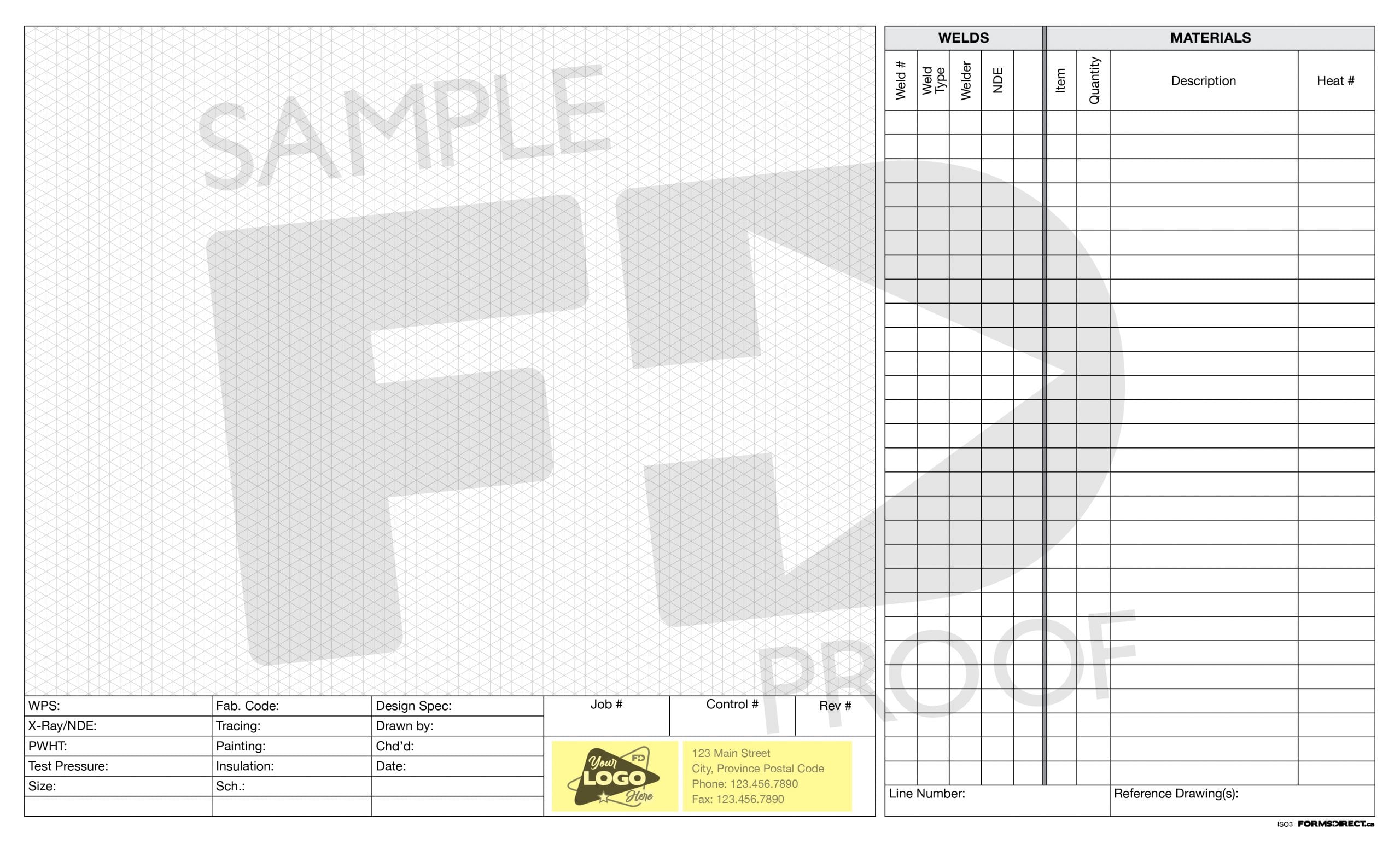 The Isometric Pad | ISO3 template comes complete with tables to include important welding and material details. Consequently, construction and welding companies will find this template perfect for them! Made for a legal page size with a landscape orientation (14″ x 8.5″), the available graph section measures at 8.5″ wide and 6.75″ deep. Additionally, the fields along the bottom of page collect numerous details specific to your project. Need any of the field names modified to fit your company’s specific needs? Just click HERE to visit the Print Your Own Design (Notepad) page. Use “ISO3” in the Template Code box to reference this template design and detail the requested modifications in the Special Instructions field.