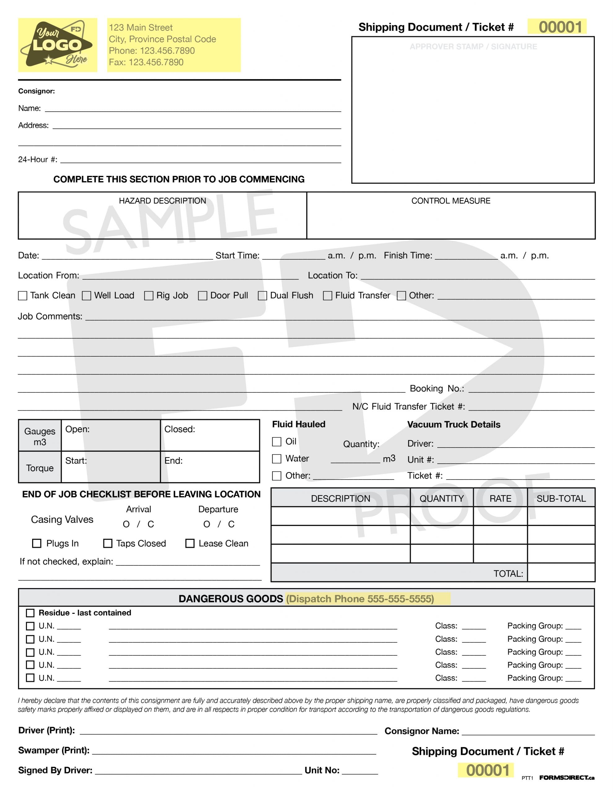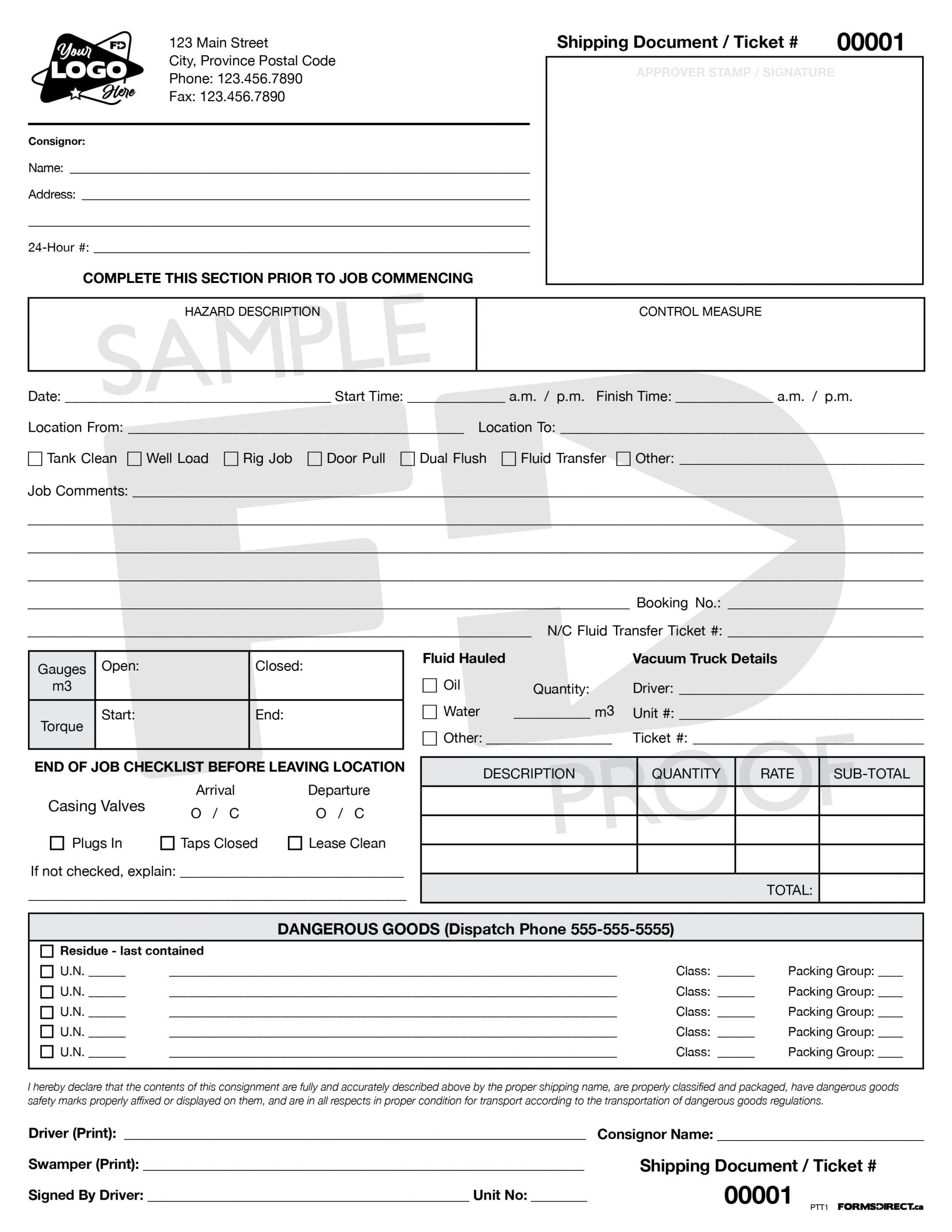 Our PTT1 Pressure Truck Ticket template is styled to include a consignor declaration statement – allowing for classification as a shipping document as well as a work ticket. A simple hazard and control table, as well as six lines for job description makes this template a favourite among operators, due to its ease of use. The dangerous goods table can hold up to five product listings and is customizable to include your unique DG contact phone number.