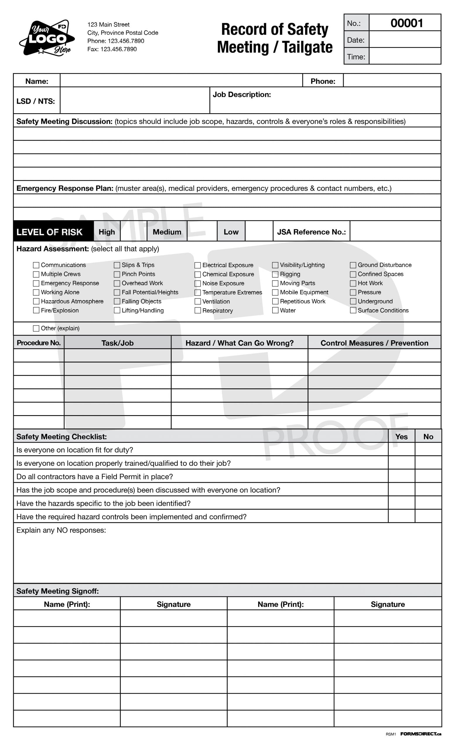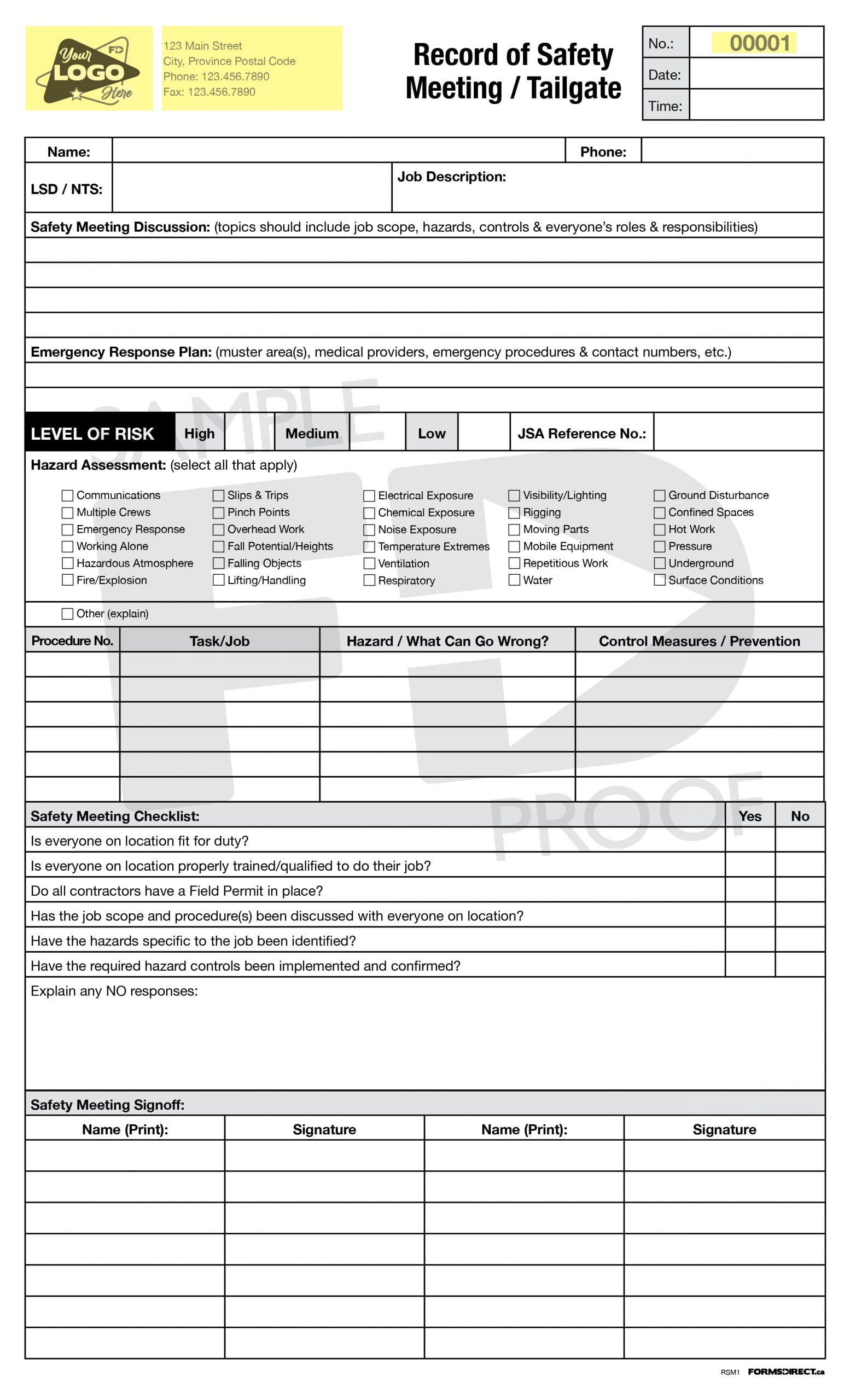 One of our best-selling safety forms, the Record of Safety Meeting | RSM1 template records safety meeting notes, your emergency response plan (ERP), a hazard assessment (both with hazard check boxes and written task steps) and meeting attendance (with room for 14 people) all in a single legal-sized form.