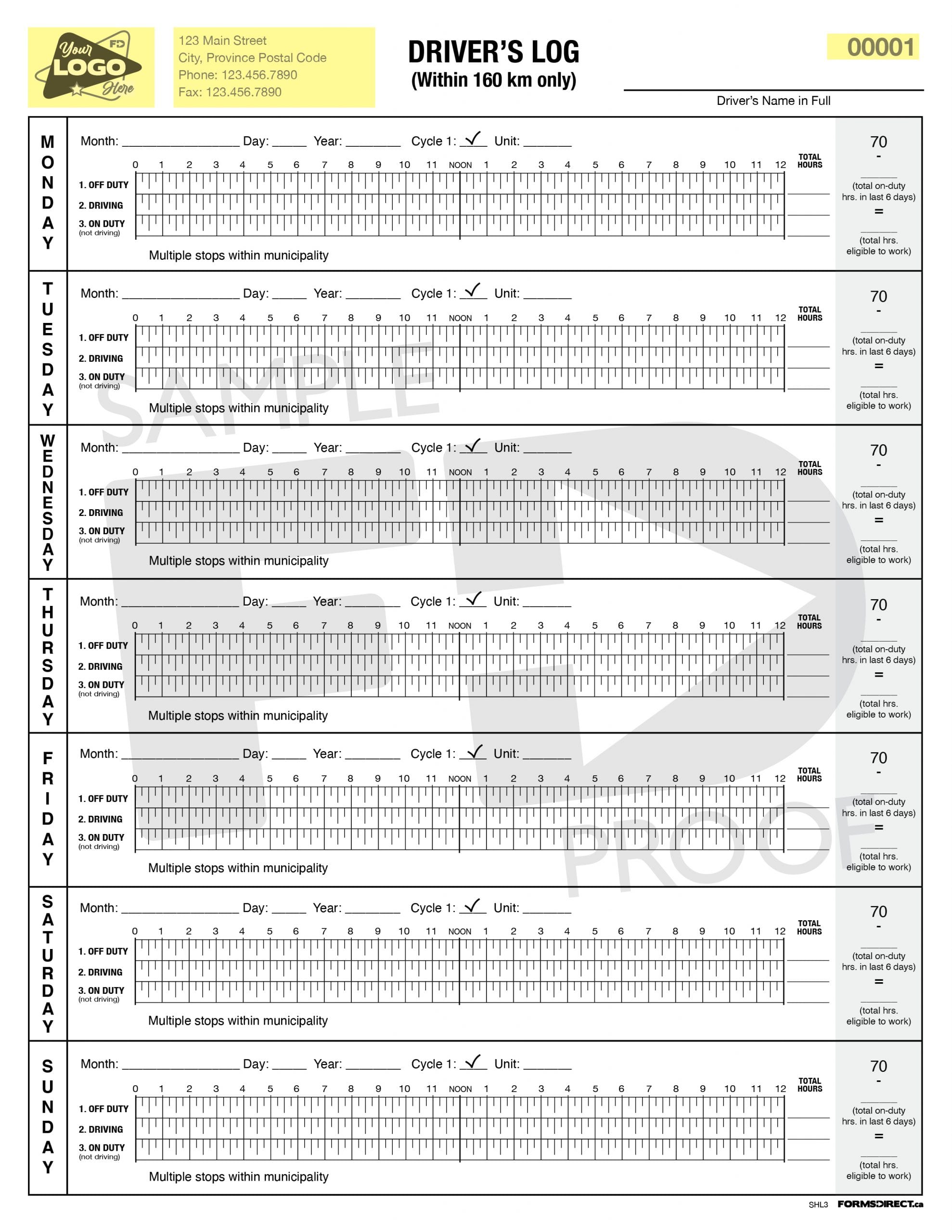 Our Short Haul Driver’s Log | SHL3 template supports seven days per page. Furthermore, it is specific to a Cycle 1 (70-hour / 7-day) schedule. This allows the user to fully log duty status changes each day in a traditional 24-hour table format. In Canada, carriers that operate exclusively within 160 kilometres of their home terminal aren’t required by Canadian law to provide detailed driver’s daily log documentation provided that they return to their home terminal to begin a minimum of 8 consecutive hours of off-duty time. However, drivers are obligated to keep accurate time records of their on-duty time for each calendar day – which is where radius records (also referred to as short haul logs) come into play.