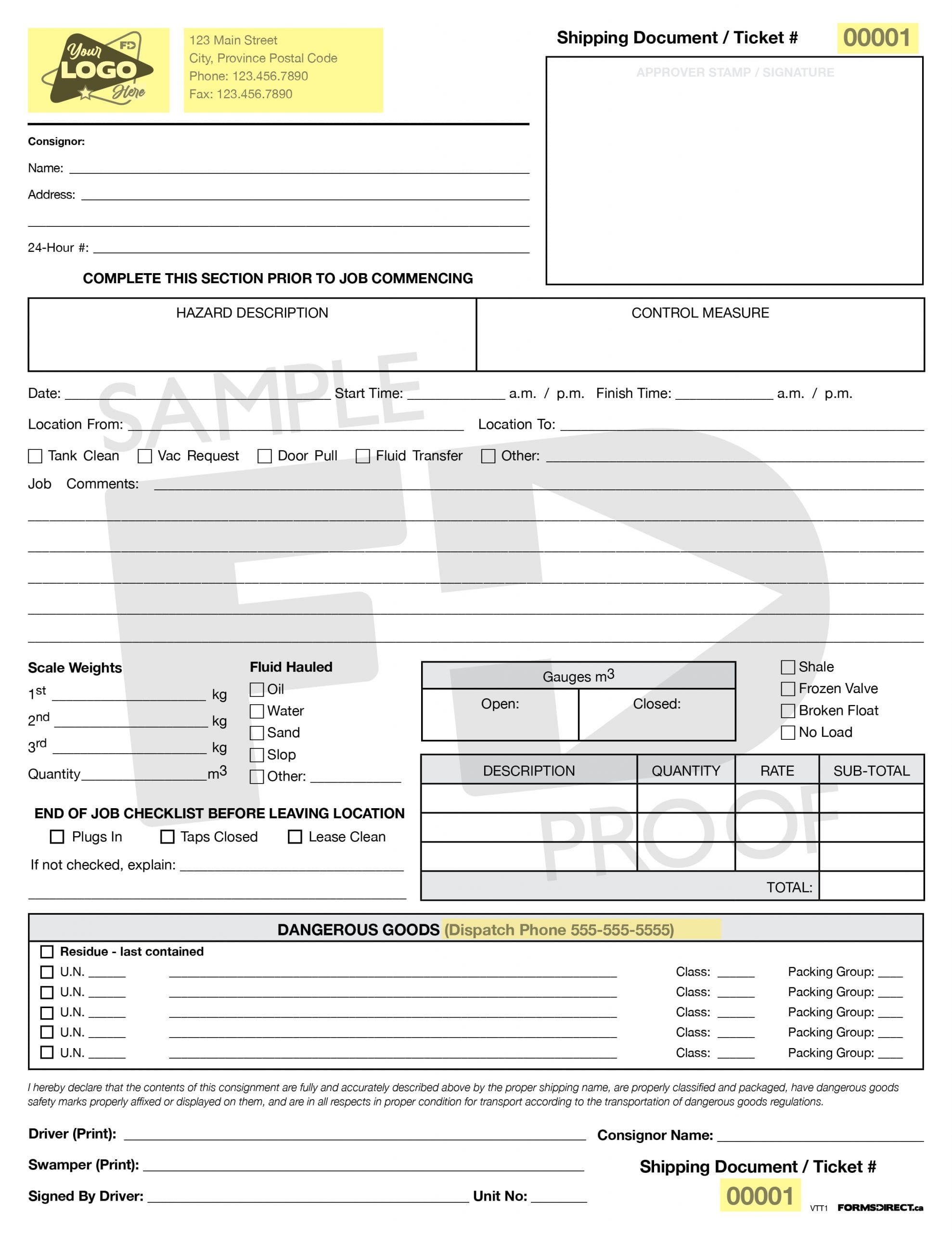 Our Vacuum Truck Ticket | VTT1 template is most functional in an oil & gas setting. VTT1 is styled to include a consignor declaration statement – allowing for classification as a shipping document as well as a work ticket. It includes job type selections such as Tank Clean, Door Pull, Fluid Transfer, etc. Easily record multiple scale weights and gauge board open and close readings. A simple hazard and control table, as well as six full-width lines for job description makes this template a favourite among operators, due to its ease of use. The dangerous goods table can hold up to five product listings and is customizable to include your unique DG contact phone number.